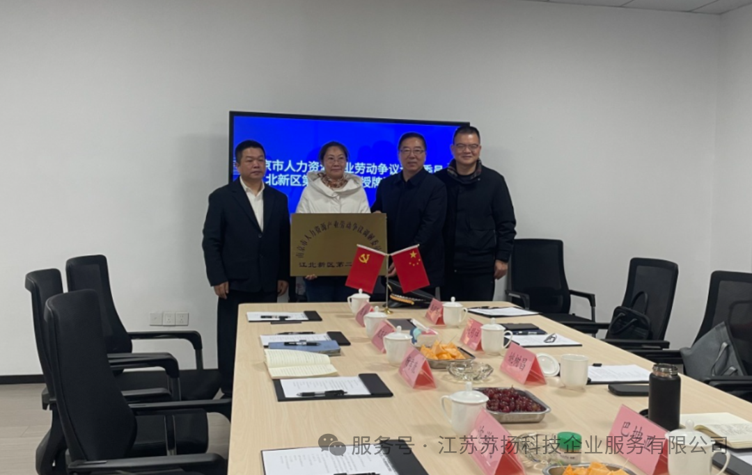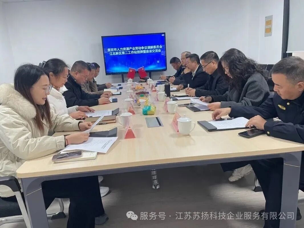 2025年11月21日,南京市人力资源产业劳动争议调解委员会江北新区第二工作站,正式在江苏苏扬科技企业服务有限公司授牌成立,并针对后续调解工作的深入开展进行了座谈交流。南京市人力资源产业协会会长巴坤亚、江北新区综合行政执法总队总队长姚树昌、协会驻会副会长兼调委会主任张明祥等领导亲临现场指导,苏扬公司董事长沈学飞、总经理沈庆和、副总经理杨孝康,人力资源总监兼工作站站长李平等公司领导参加此次活动。